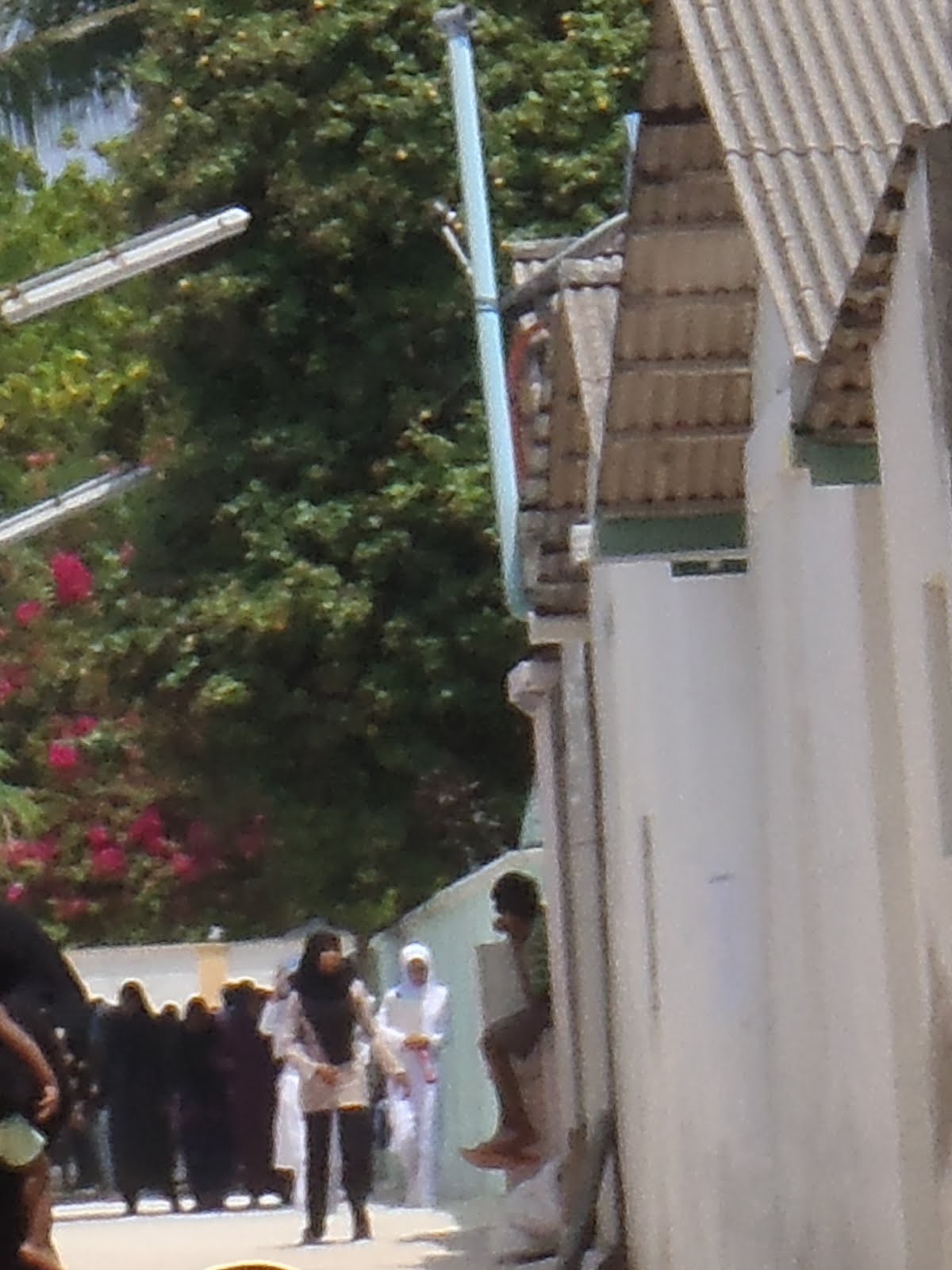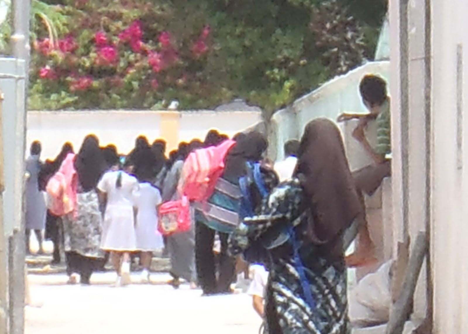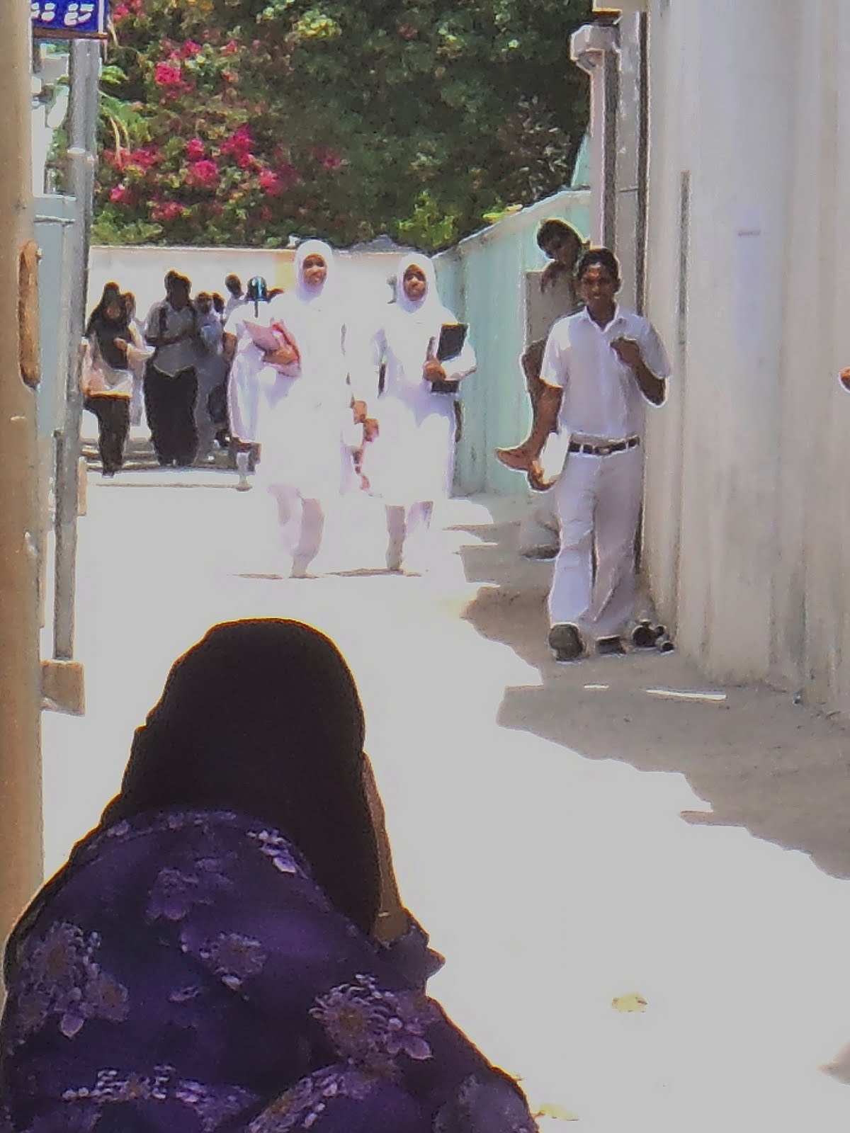 Al rato aparecen los alumnos de enseñanza media volviendo a sus casas, ellas siempre de blanco inmaculado y llevando el velo, que acá se llama Burga, del mismo color del uniforme. Lo comienzan a usar como  a los doce años, mas o menos cuando las niñas comienzan su regla. En las ciudades como Male se pueden ver eso si niñitas usando velo. Desde el momento en que se ponen el velo deben cubrir su cuerpo y sólo dejar a la vista el rostro y las manos. Los pies también deben estar cubiertos y es por eso que las veo a casi todas con calcetines y zapatos o chalas… siempre con calcetines. Las niñitas, de pequeñas cominzan  a maquillarse, he visto niñitas de la pre school con lapiz labial en sus labios. Para ellas es natural.