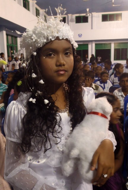 Vuelvo de la escuela grande, despues de ver a Dumia cantar «Mary has a little lamb» en la english week. A tan ilustre visita, las profesoras de la India le dicen que se siente adelante, todo un honor. Ellas son parte del jurado y organizan todo. Hay bastante profesor de la India muchos enseñana matemáticas, contabilidad e inglés. Camino tranquila por la calle que me llevará de vuelta a mi dirmitorio recien aseado, con cloro logicamente. La temperatura está deliciosa, corre una brisa que da gusto y la luna nueva acaba de ponerse en el horizonte. Me vengo agradeciendo estos momentos tan simples y que me hacen sentir bien.