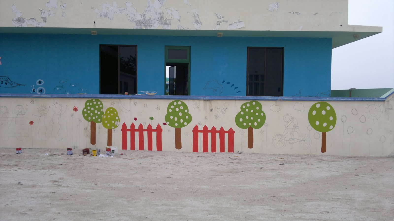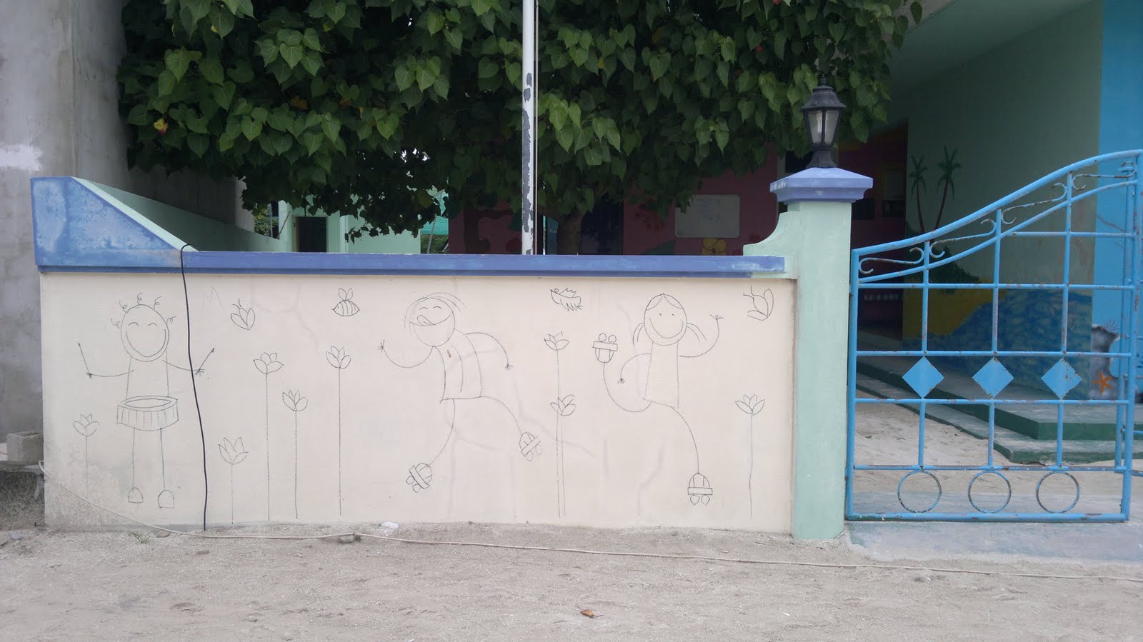 La cosa es que después de dibujar ayer el muro del patio, Gada me propone que dibujemos también el muro de la entrada. Así que partí a dibujar ese y hoy comencé la pintura por ahí mismo. Ahora si que soy famosa!!! Gracias al gentil auspicio de Fundación Curarte de España porque les copié los dibujos. Algo les modifiqué por siaca, no vaya a ser que llegue justo el autor de esos dibujos por estas lejanas latitudes. Aunque acá hasta el windows de los computadores es pirateado!!! pero igual, just in case.