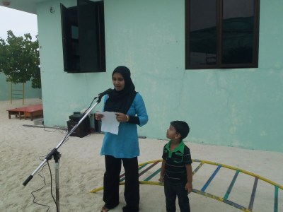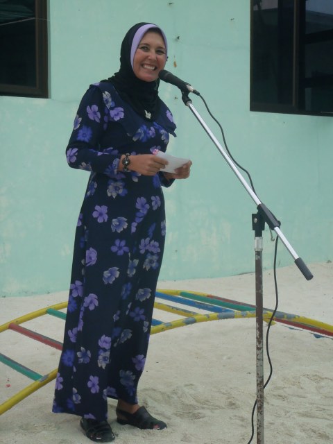 Salgo rumbo a la pre school y mientras camino voy viendo cabezas asomándose a mi paso. Las niñas me miran y llegan corriendo, las mujeres facinadas y los hombres para que les cuento. A una cuadra de la escuela, me ve Ali y otras dos  autoridades y quedan boquiabiertos, las fotos van y vienen. Fue también una sorpresa para Gadha que estuvo todo el día ajetreada con la organización. Entramos al patio de atrás y se oye de a poco ohh ohh. Es entretenido, las sonrisas llueven, algunos niños me miran extrañados y otros les encanta.