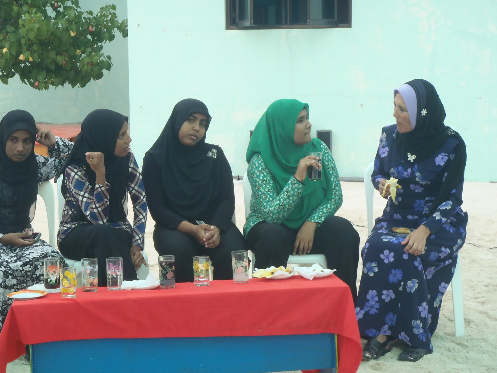 Llega Hilma, Zeena,Rasheeda y Madeeha a avisarme que un cuarto para las cinco debo estar en la escuela. Mientras conversamos me proponen que me vista como ellas lo que me pareció  buena idea.
