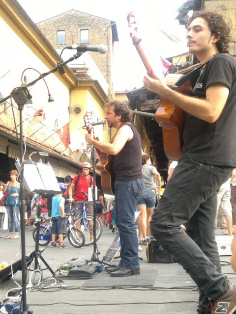 Ya en el puente los dos músicos que cada tarde se disponen a cantar están comenzando su presentación. Dos hombres, el que canta es la cara visible del grupo, la parte social. Habla con la gente, coquetea con las turistas y lleva el liderazgo cuando deben salir a mezclarse con los turistas mientras cantan. De sólo oírlo cantar en italiano con su voz rasposa uno se enamora de él. El otro, callado, es el músico del grupo. Es quien cambia de instrumento durante la presentación. Dos guitarras y un violín son sus compañeros. No es tan llamativo como el otro pero con esos tres instrumentos tiene curvas para rato!!