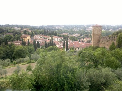 El día está en extremo caluroso y a nosotras se nos ocurrió venir nada menos que a la una de la tarde. Que par de bestias!! Es sol nos calcina, mis piernas tiene hasta ampollitas de agua en ellas pese a haberme puesto bloqueador, caminamos conversando hasta que al llegar auna cumbre encontramos un descanso, una especie de plaza donde turistas y más de algún italiano de vacaciones por acá disfrutamos del frescor de la sombra de los árboles y de un rico y fresco almuerzo compuesto de fruta y agua.
