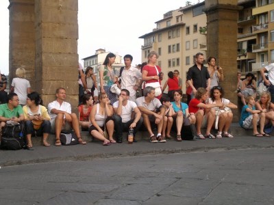 Los aplausos se sienten, las cámaras fotográficas, los teléfonos, las filmadoras, con lo que sea, nosotros, los turistas de Florencia tratamos de captar para recordar, la atmósfera tan especial de este atardecer de verano en el Ponte Vecchio con el sol tocando el suelo, las tiendas del puente ya cerradas y nosotros dándonos un momento mas de felicidad…