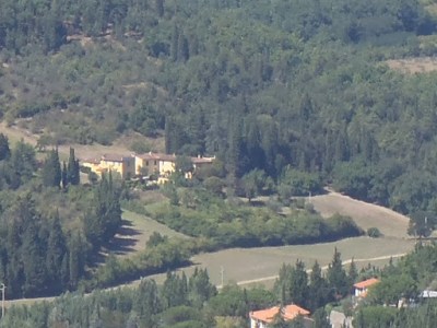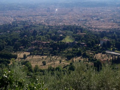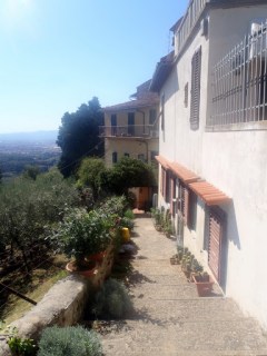 Fiesole queda sobre un cerro y la ruta es bellísima. Casas grandes se van sucediendo una tras otra, pequeños palacios. Al mirar hacia atrás vamos viendo Florencia desde las alturas.