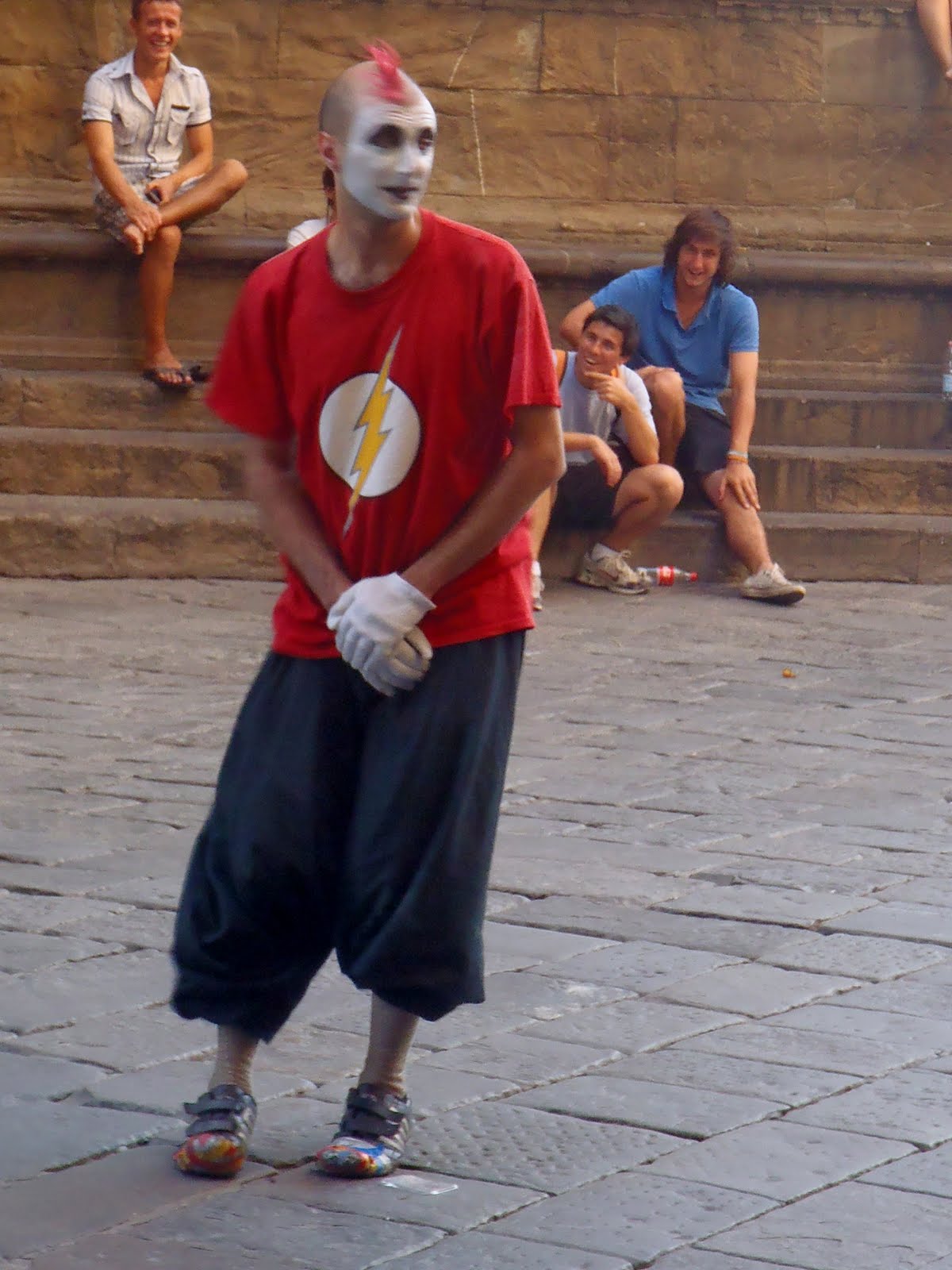 Un mimo haciendo de las suyas pero le salió el tiro por la culata, siguiendo a un señor, este se dió media vuelta y le agarró los testículos… todos aplaudimos, pobre…