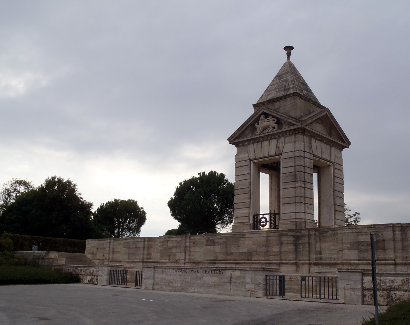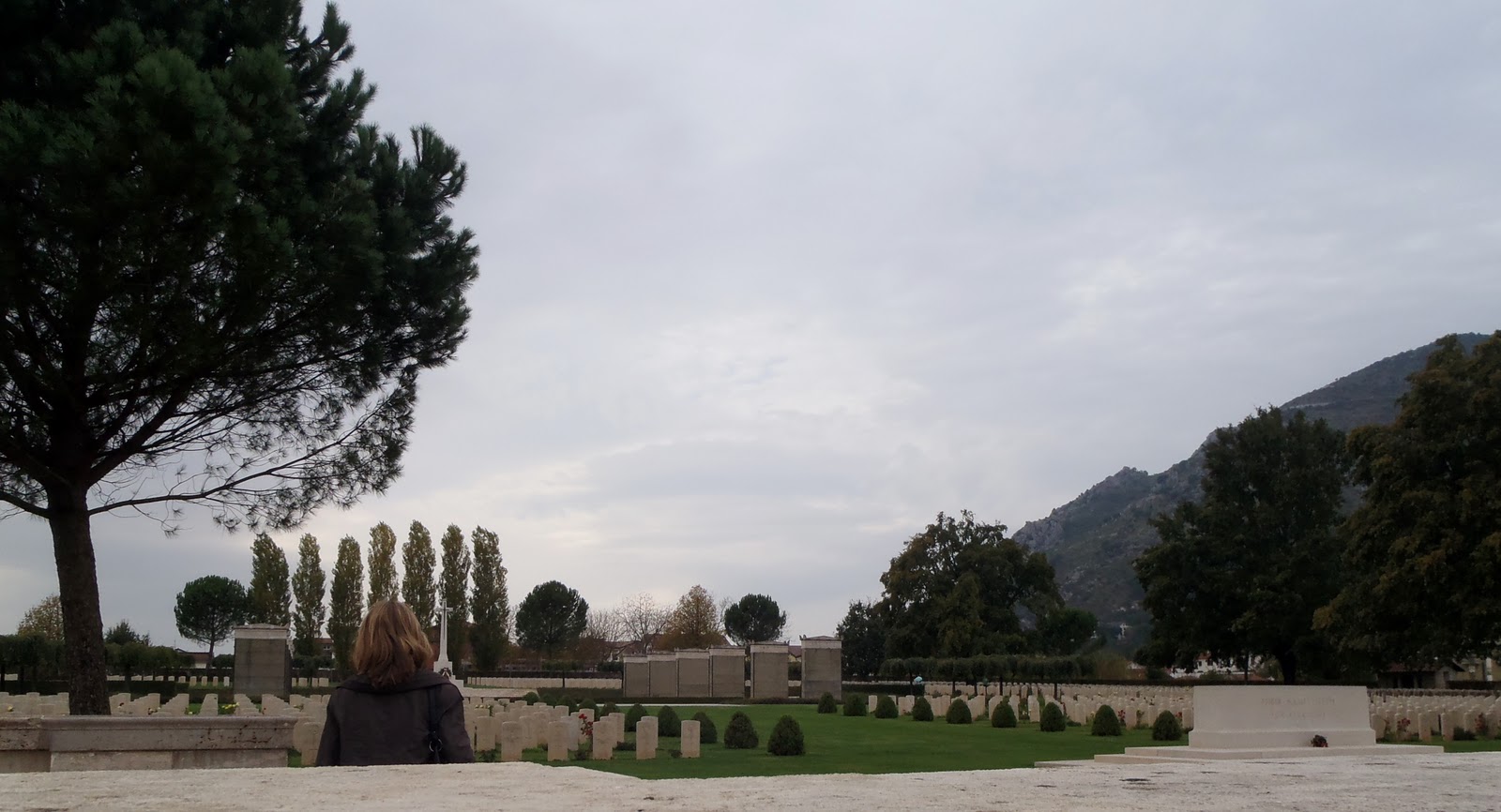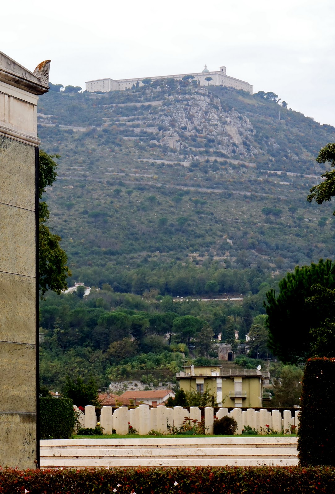Llegando a Cassino, verificamos horario de vuelta y averiguamos donde estaba la parada para tomar el bus a la abadía. Debíamos esperar dos horas así que nos fuimos a deambular por el pueblo. Luego de un rato llegamos a un hermoso cementerio, el de la Comonwealth. Bueno no se si tan hermoso. A mi los cementerios de encantan asi que si estoy en uno de ellos me siento en paz. Desde el cementerio se ve la abadía.